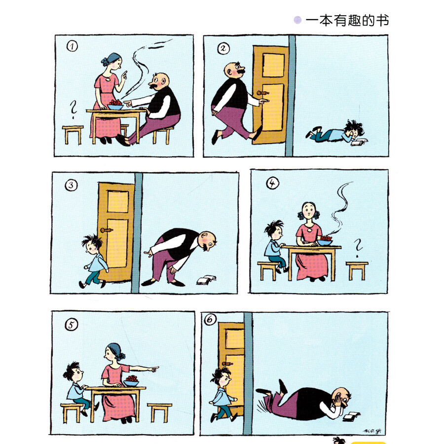儿子依依不舍地站起来,走出了房门。爸爸想,这孩子看的是什么书,这么吸引人?爸爸弯下腰,低着头,好奇地看了看地上的这本书。爸爸恍然大悟,说:“原来是《猫和老鼠》呀!”